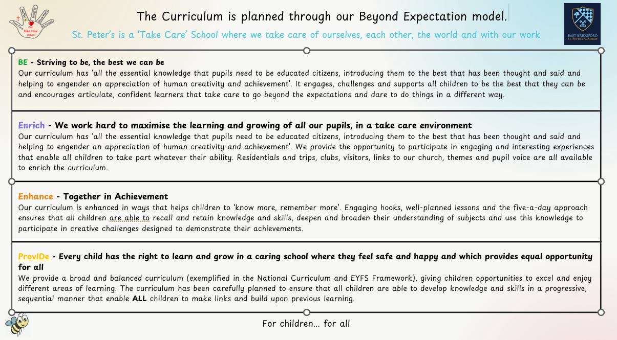 Subject specific information on how we implement our Beyond Expectation curriculum can be found in the subject tabs.