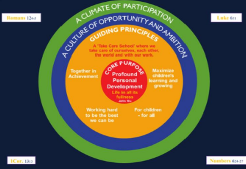 Our Take Care Approach ensures that our ethos and curriculum are both deeply rooted in our Christian values, and we place an equal importance on nurturing the academic and personal development of all our children. Celebrating diversity and encouraging children to 'dare to be different', we believe that our children can make a difference in the world. Learning to reflect and respond thoughtfully, we want them to learn to be the best that they can be by taking care of themselves, each other, the world and with their work.
