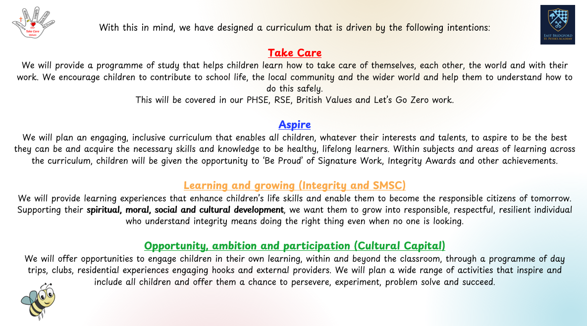 Driven by our values and the four learning intentions detailed below, we have created a thematic spiral curriculum that prepares all our children to leave St. Peter's equipped to become a Take Care person. Ensuring strong foundations in reading, writing, mathematics and oracy, our curriculum enables pupils to access learning confidently across all subjects. This broad and balanced curriculum builds upon children's prior learning, helping them to acquire essential knowledge and skills and encourage curiosity and enthusiasm for learning.